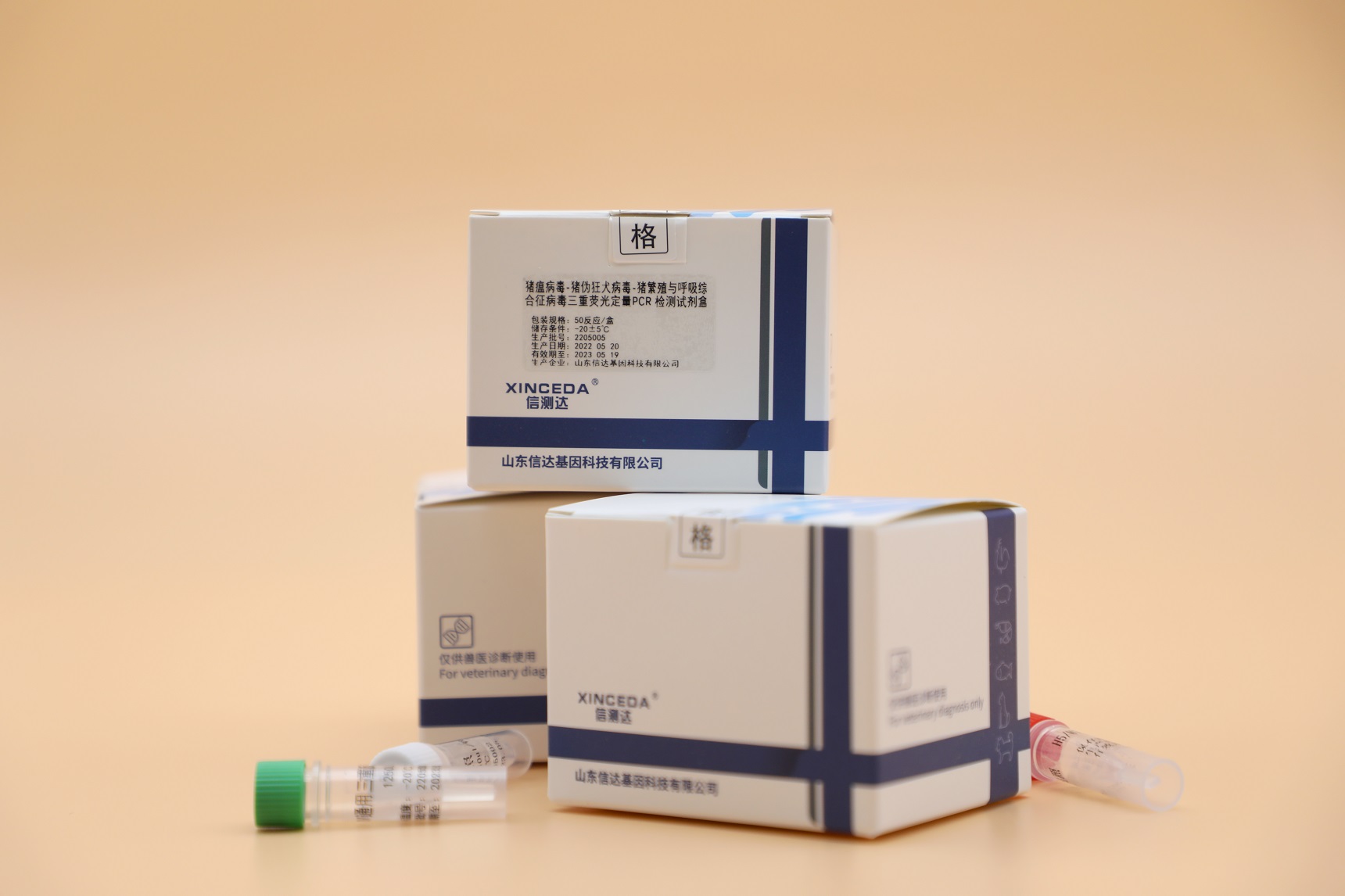 检验原理:本试剂盒基于实时荧光PCR技术,选取猪瘟病毒、猪伪狂犬病毒、猪繁殖与呼吸综合征病毒基因组高度保守区域设计特异性引物和探针,通过一步法实时荧光PCR体系扩增对猪瘟病毒、猪伪狂犬病毒、猪繁殖与呼吸综合征病毒进行定性检测。反应体系中除特异性引物和特异性荧光探针外,还配以优化的PCR Buffer、逆转录酶、热启动酶、dNTPs、Mg2+等成分,即开即用,可实现对猪瘟病毒、猪伪狂犬病毒、猪繁殖与呼吸综合征病毒核酸高灵敏特异性检测。
